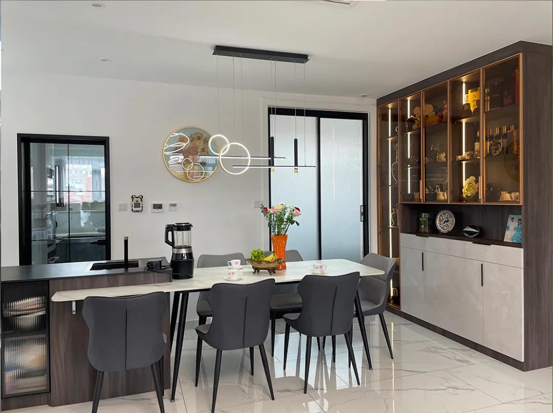 设计师将客厅、餐厅、卧室的轻体隔断墙拆除,对整个空间重新划分,借助采光、造型、以及灯光的运用,让武女士家的这个公共空间,实现了最大化的利用。
