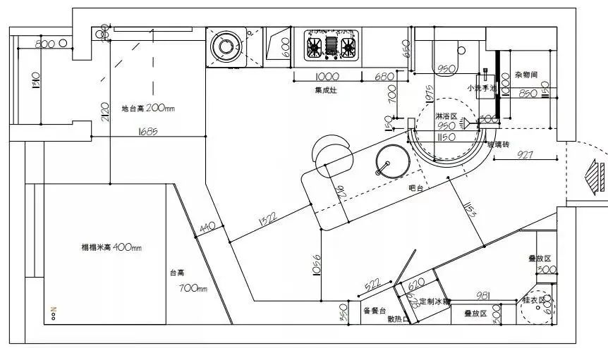 设计师贾向楠对整体格局重新规划,将卫生间缩小至2平米,但里面该有的功能也全都有,而且原来的暗卫生还用玻璃砖的形式变成了明卫,改造后的卫生间可以称得上麻雀虽小五脏俱全。