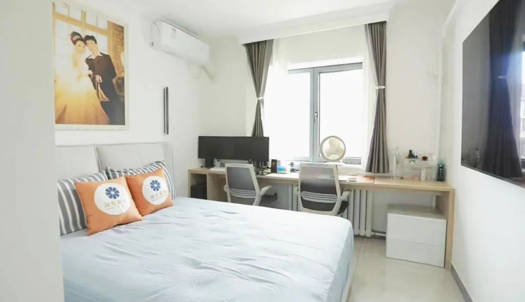 设计师拆除了次卧阳台的推拉门,将阳台的采光引入卧室,让整个空间更加明亮温馨,利用润元的定制家具,打造了一组集储物、上网休闲的多功能定制柜,以及一组斗柜,增加了次卧的收纳空间。