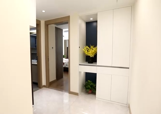 设计师扩宽了过道空间,将卫生间与过道共用的一面墙体向内推了40厘米,利用润元定制家具沿墙体打造一组通顶鞋帽柜,满足了一家人的储物需求,顶部利用筒灯结合磁吸轨道灯的设计,让整个门厅以及过道空间光线更加充足。